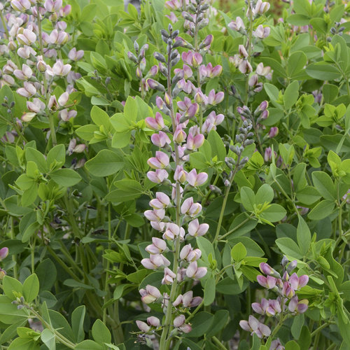 This very long-blooming perennial has soft pink flowers that appear atop the compact clump of deep blue-green foliage in spring. The flowers lighten to lavender with age. Baptisia grow best in full sun and average to poor, well-drained soil. Moderately drought tolerant once established.