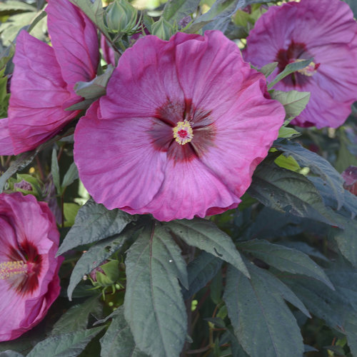 The big (7-8 inches!), ruffled, lavender pink flowers with a cherry red eye are produced all over the densely compact, shrub-like clump of attractive midnight green foliage. This hibiscus is a tough and adaptable perennial that will grow in almost any soil. Plant in full sun for optimum flowering performance.