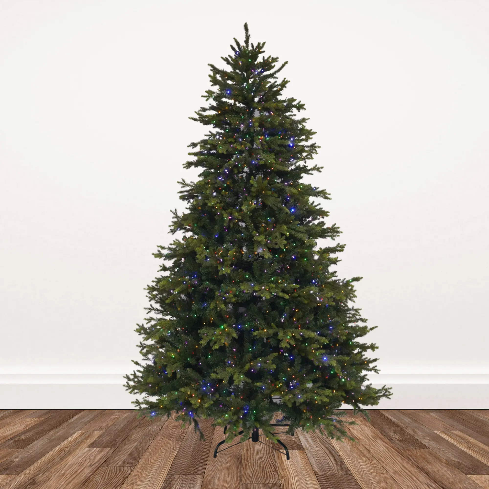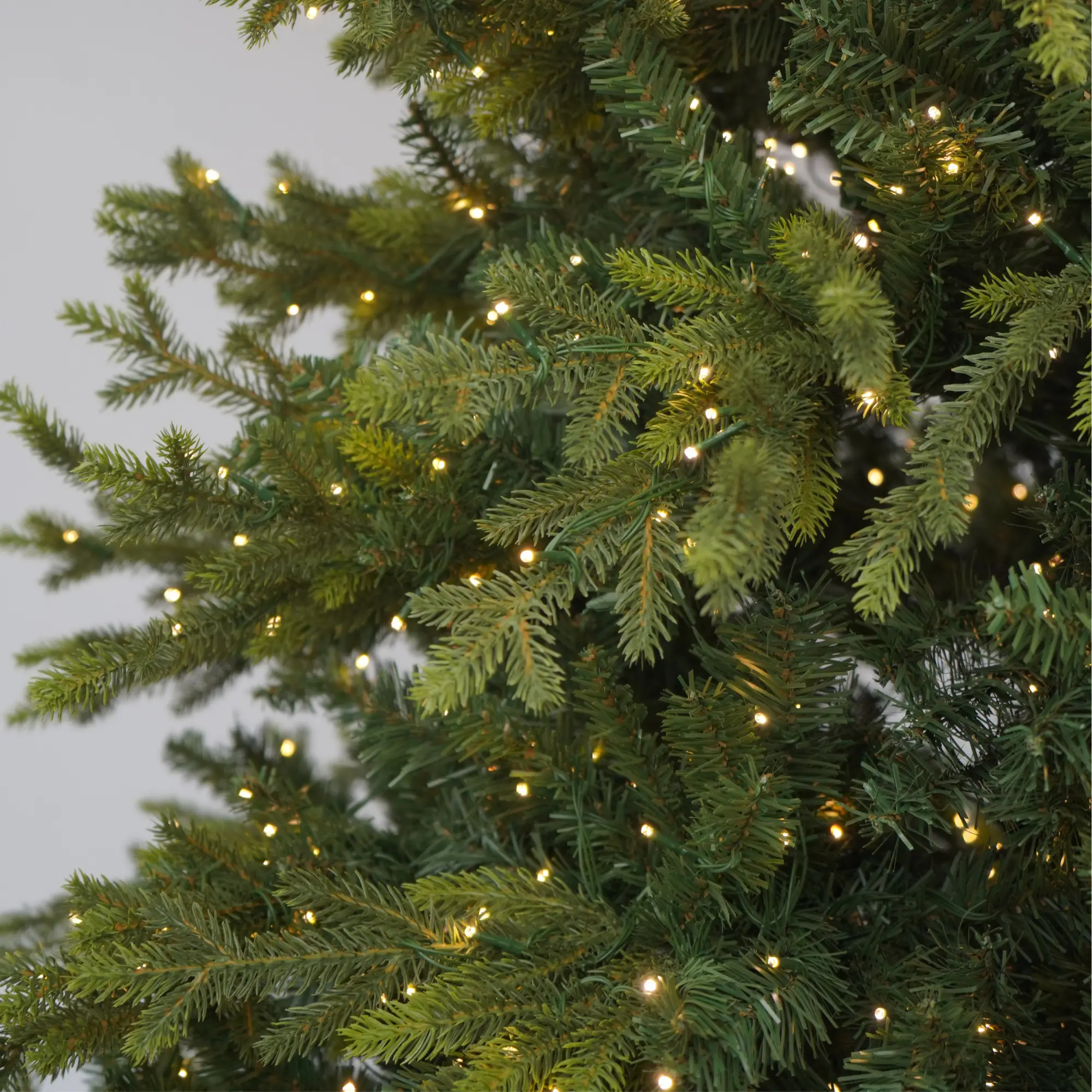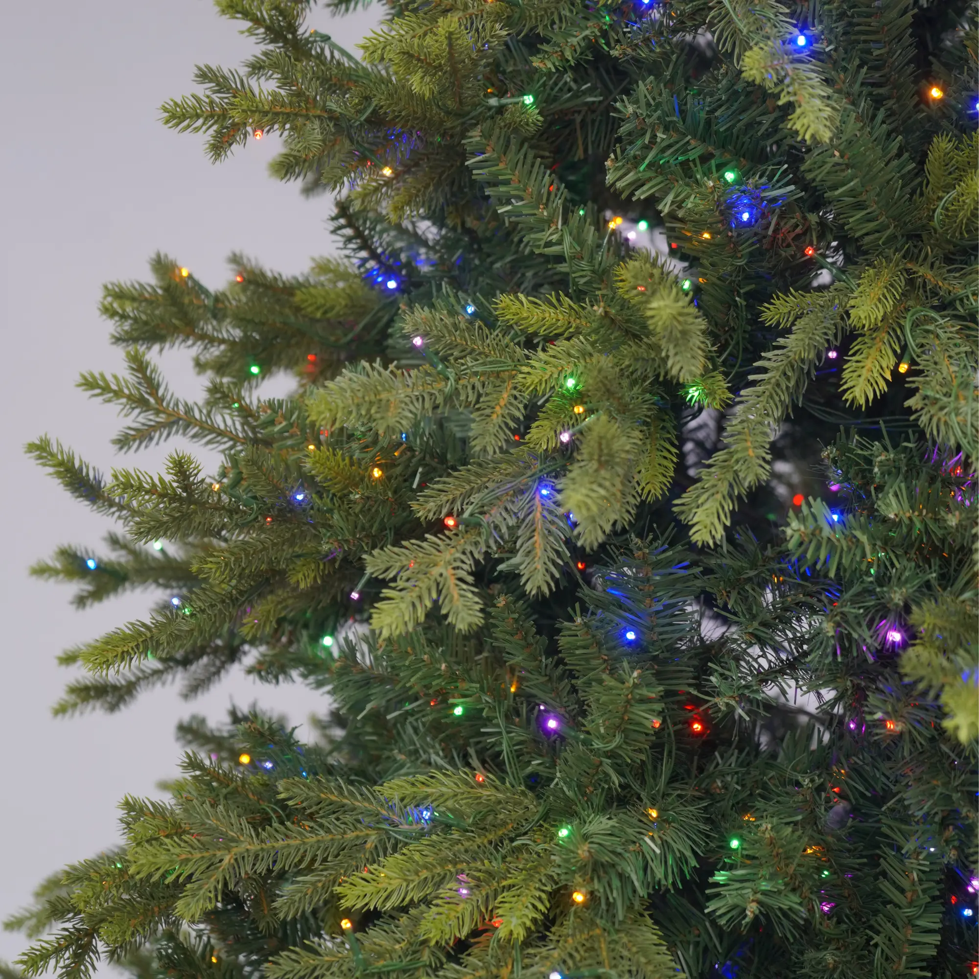 Pre-lit with 2200 Dual Color 3mm Spider L.E.D. Lights. 20,000 Hour Low Voltage Warm White and Multi Color Lights with Power Connect Pole and Multiple Function Remote.