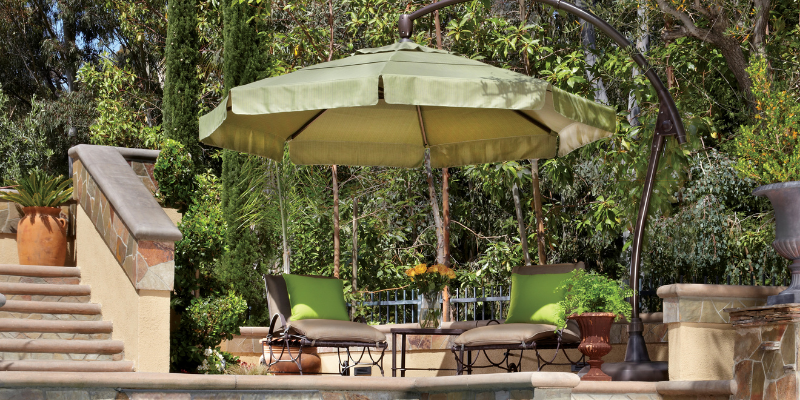 Shading your patio during the day is a must to fully enjoy your outdoor space. A large cantilever umbrella is the perfect solution to protect you from the sun’s rays. These large umbrellas can cover your entire patio and can be easily repositioned to block the sun at any time of day. When the sun goes down, so does the umbrella. Cantilevers fold up nicely so they are out of the way in the evening.