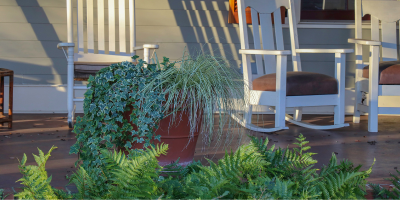 Bring your house plants outdoors and create a tropical retreat. Use palms and ficus to add some height. Ferns make great hanging plants, and sansevierias, crotons, and philodendrons will add some height and texture variation. Add pops of color with bromeliads, succulents and container gardens filled with annuals.