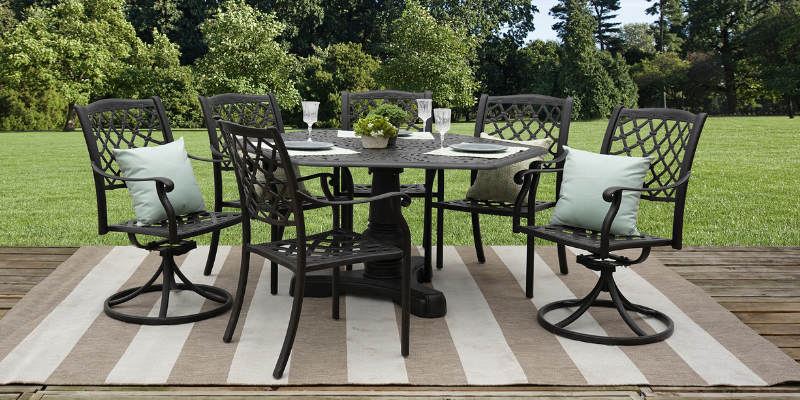 Also consider material. Choosing wrought iron or all-weather wicker will increase the longevity of your set so you can use it year after year. These materials can withstand heat, rain and sun and still look great.