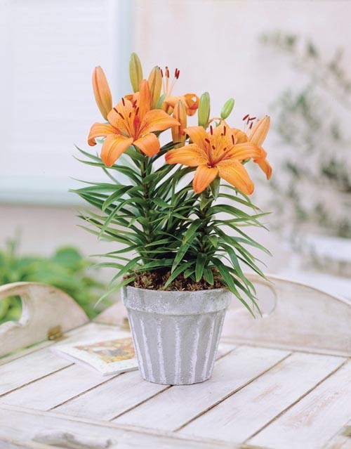 Pixie Lilies are a dwarf variety of Asiatic lilies that will reach a mature height of 12 to 14 inches. The bright orange blossoms have an elegance to them, bringing a refreshing garden feeling to any room. Pixie Lilies like bright light.