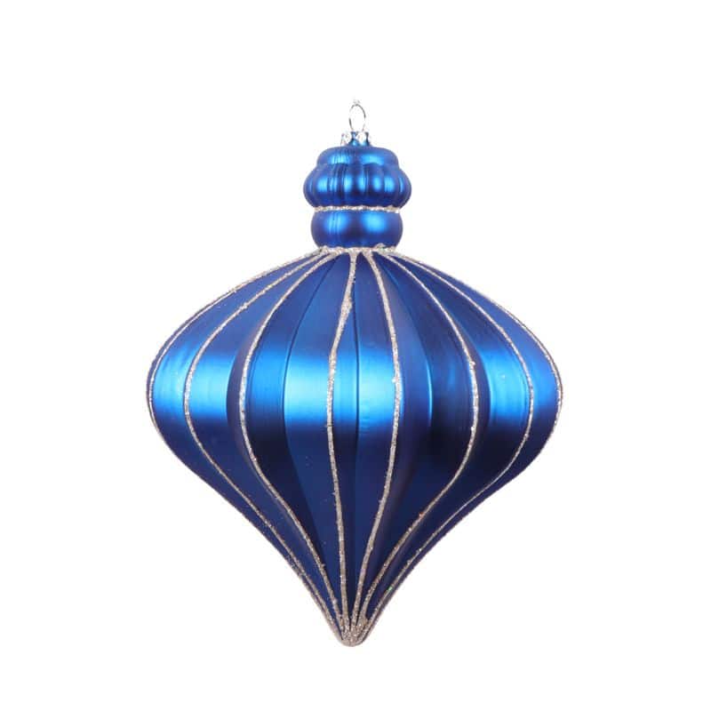 This 7-inch shiny blue ornament is decorated with a champagne glitter design.