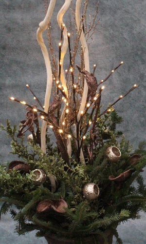 This container garden features multiple nature-inspired elements with a glittery twist. LED twigs sparkle and reflect against the picks in this container.