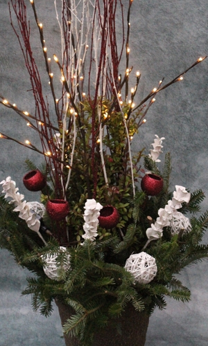 LED branches expertly placed inside container gardens can light the way to your home. White eucalyptus and sparkling red picks make great additions.