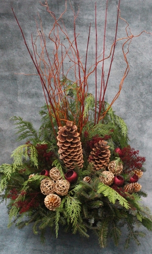 Traditional holiday-inspired hues such as red and gold stand out against green fresh-cut branches.