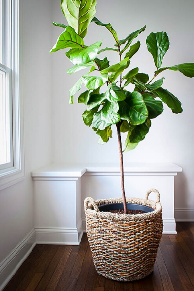 FIDDLE LEAF FIG trees are the perfect focal point plant. Boasting rich, glossy, green leaves, this plant is a piece of art on its own! Fiddle leaf fig trees are great for filling an empty space or gap in a room. Try one in a whimsical, colored pot or a wicker basket and let the sculpture-like branches instantly draw the eye. If your home has a lot of green décor or paint tones, your fiddle leaf fig will instantly enhance this design scheme.