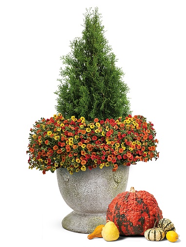 Refresh existing planters with a ring of colorful cold-tolerant annuals. If you have an arborvitae or boxwood that you planted earlier in the season, use it as the centerpiece and add plants that’ll flourish when the weather gets cooler. (Be aware that this arborvitae will not survive the winter.) Use plants, such as Supertunia, Superbells (pictured) or Superbenas from Proven Winners.