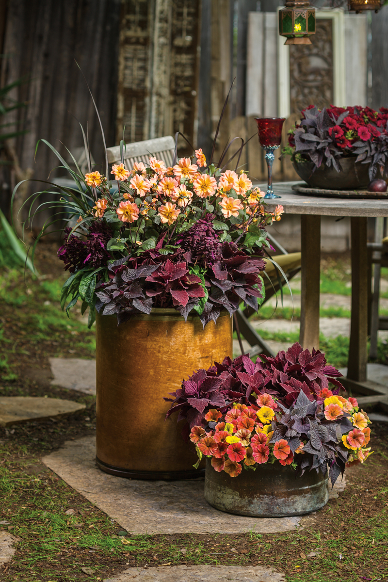 Use plants that will tolerate the cold and will be able to thrive well into the season. The containers above feature plants from Proven Winners – Dahlightful Dahlias, Grace Grasses, ColorBlaze Coleus, and Salvia.