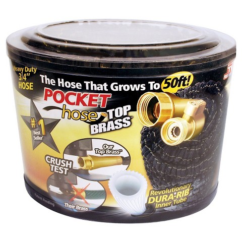 7. 50’ Pocket Hose Top Brass – The New & Improved version of the Pocket Hose, the hose that grows! Stronger than ever, Top Brass has connector protectors on both ends to prevent damage and leaks. Available in all stores.