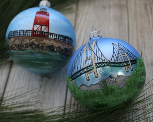 If the artist in your life enjoys painting “en plein air,” inspire them with hand-painted ornaments featuring various Michigan sceneries. From the Mackinaw Bridge to the Charlevoix Lighthouse, each scene is accentuated by splashes of glitter that twinkle against tree lights.