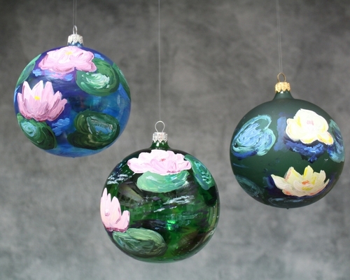 The centerpiece of this theme is an imported, hand-painted European Monet-inspired ornament. Available in three different colors, each ornament features intricately painted water lilies. The artist in your life will cherish this ornament for its exclusivity and uniqueness. Monet was a French Impressionist painter that will inspire the artist in your life.