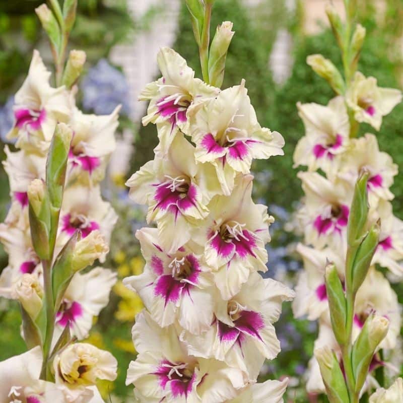 A creamy white Gladioli with contrasting lilac throats. Ideal for the summer border.