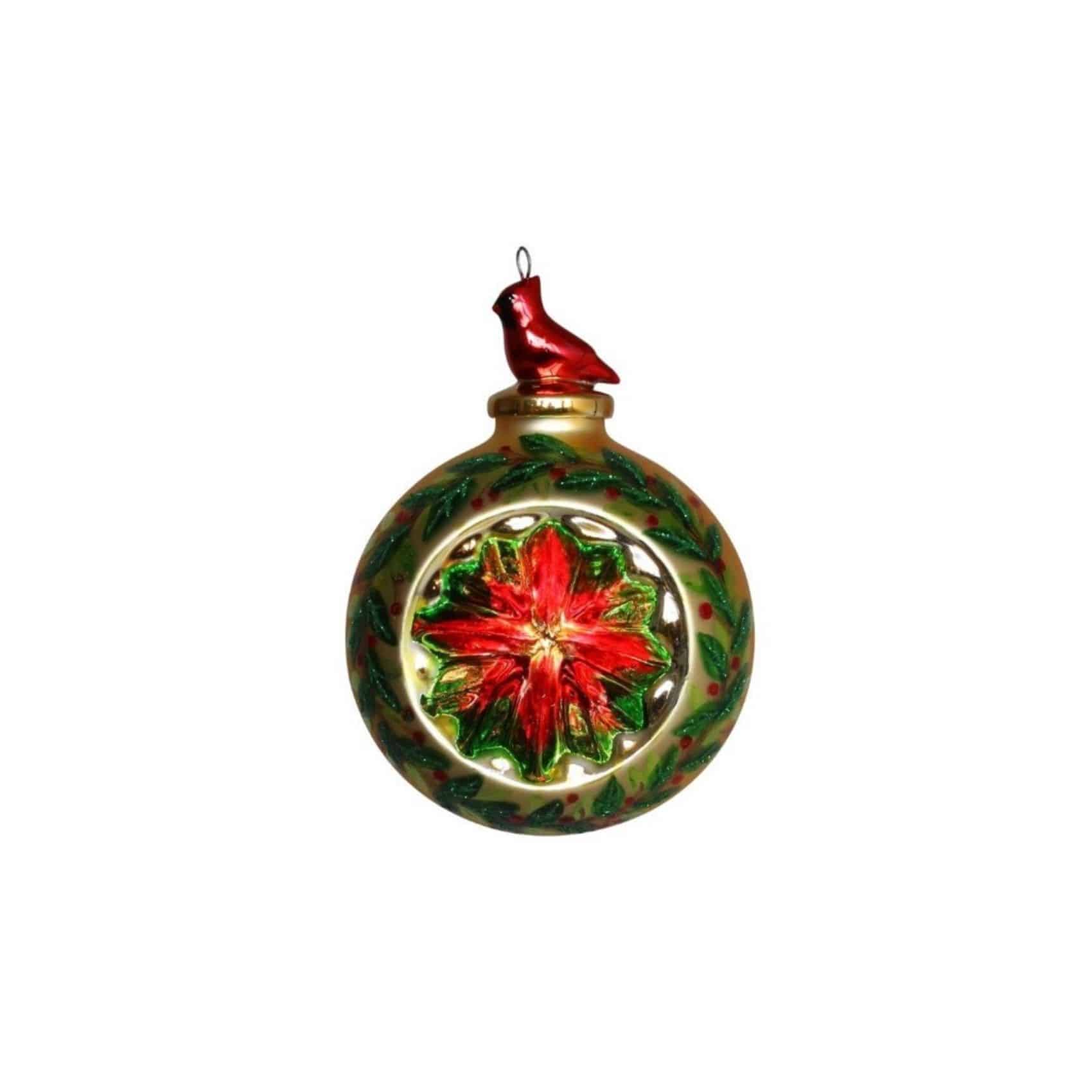 Traditionally colored glass Christmas ornament with reflector, featuring a porcelain cardinal topping detail.