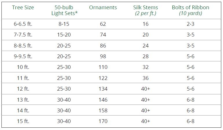 - Lights: If you will only see the front of the tree, you should still light it all the way around. Decorations only need to be added on the sides you’ll see. Following are our recommendations for a professional look: