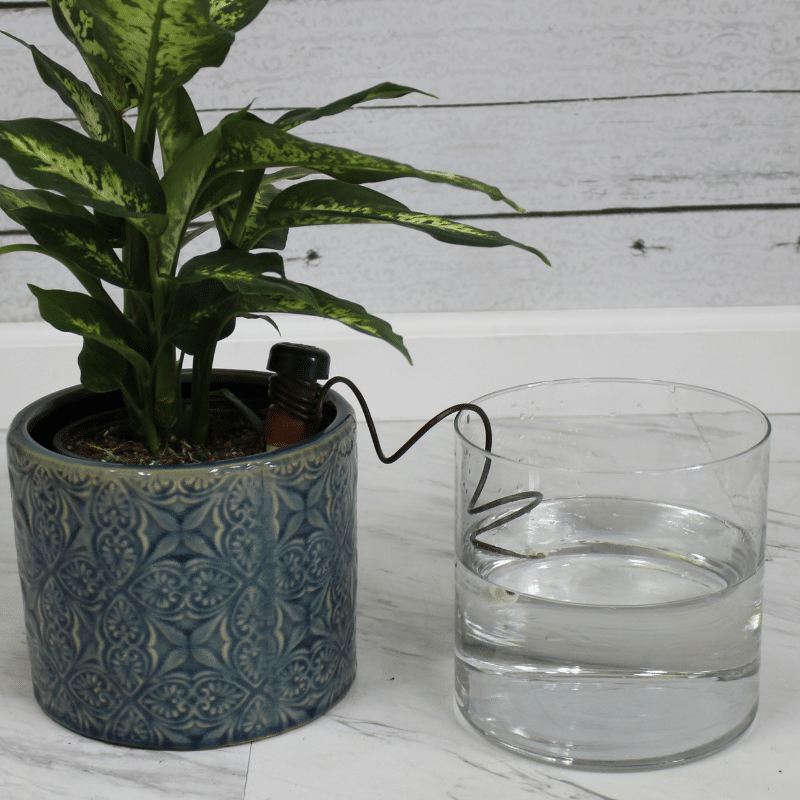 - Plant Pals: These terra cotta spikes allow you to use a wine or long-neck bottle to water your plants. Fill the bottle with water, rest the neck of the bottle in the top of the spike, and push the spike into the soil. The spike is designed to release water to the roots of your plants as needed. This will also last at least a week, depending on the plant’s needs.