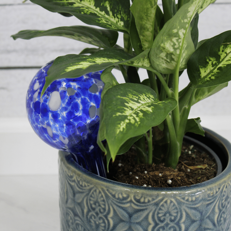 - Glass Plant Quencher. These are colorful globes with spike ends. Simply fill up with water and stick it in your pots and hanging baskets. Water will slowly drip into the pot as the roots need it. This will last at least a week.