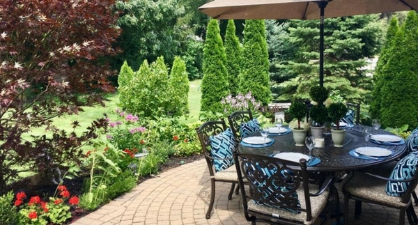Martha shared her gorgeous backyard with us! Her winding patio is accented by multiple perennials.