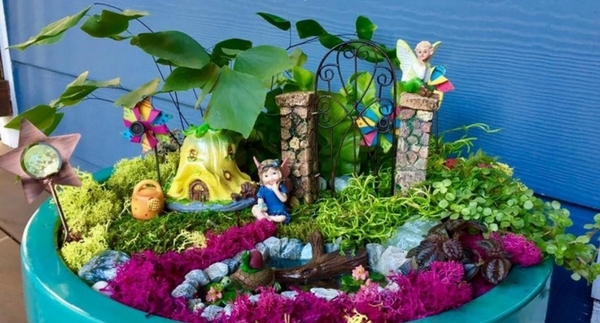 We also received this whimsical fairy garden from Sheay. The striking pink moss at the forefront accents the fun fairy pond and other miniatures incorporated in this garden.