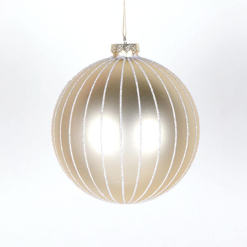 This 120mm matte champagne ornament is covered with shiny silver stripes.