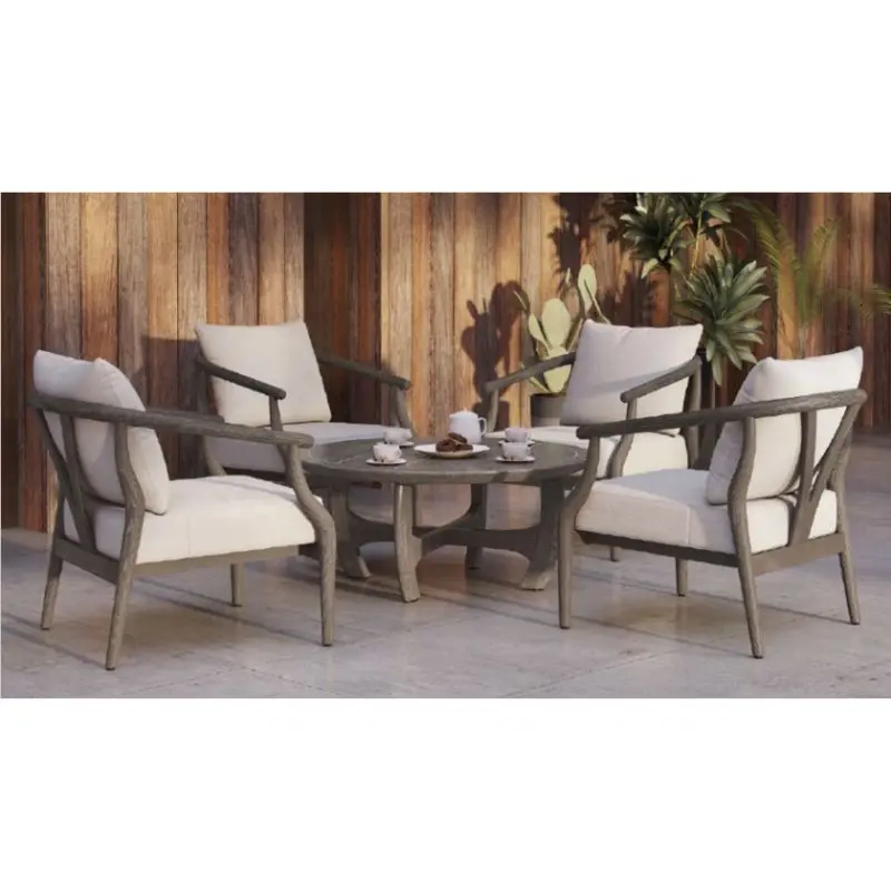 This Ming Chat Set features 4 Arm Chairs and a 42″ Round Coffee Table in Cerused Oak Neuwood frame and Cream Solution Died Olefin Cushions.
