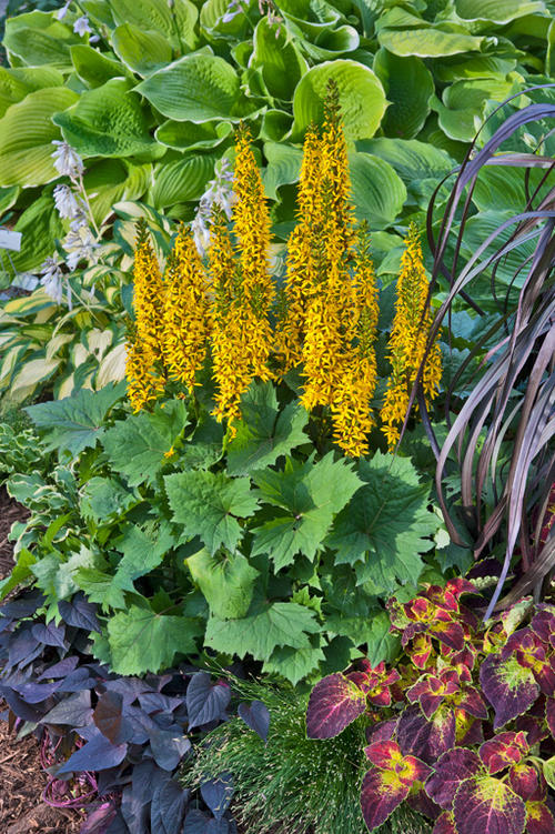 This plant will make a statement in your shade garden with its bright mustard yellow flower spikes in summer. Very large, thick, serrated leaves form a compact plant. The plant likes water, so do not use in a dry part of your landscape.