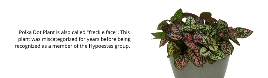 These plants are relatively low maintenance and establish quickly in most indoor environments. Bright, indirect light is ideal for the Polka Dot Plant, however, their variegation will start to fade to a light green the more sunlight they are exposed to. Lower lighting conditions will keep the variegation bright but will cause the plant to get leggy.