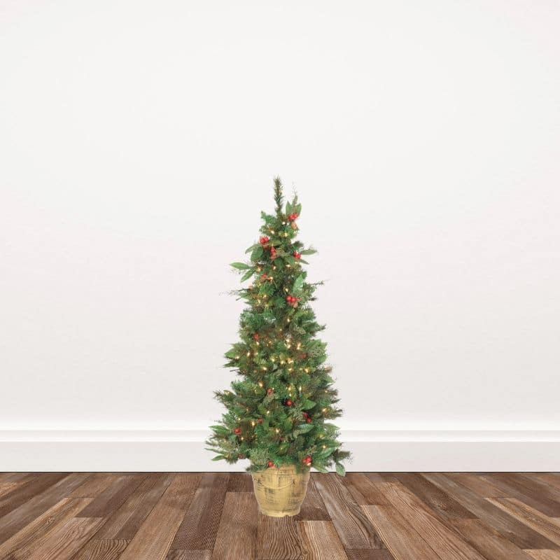 Potted Entrance Artificial Christmas Tree Decorated and Pre-lit with 200 Clear Sure Lit Lights, 5-foot