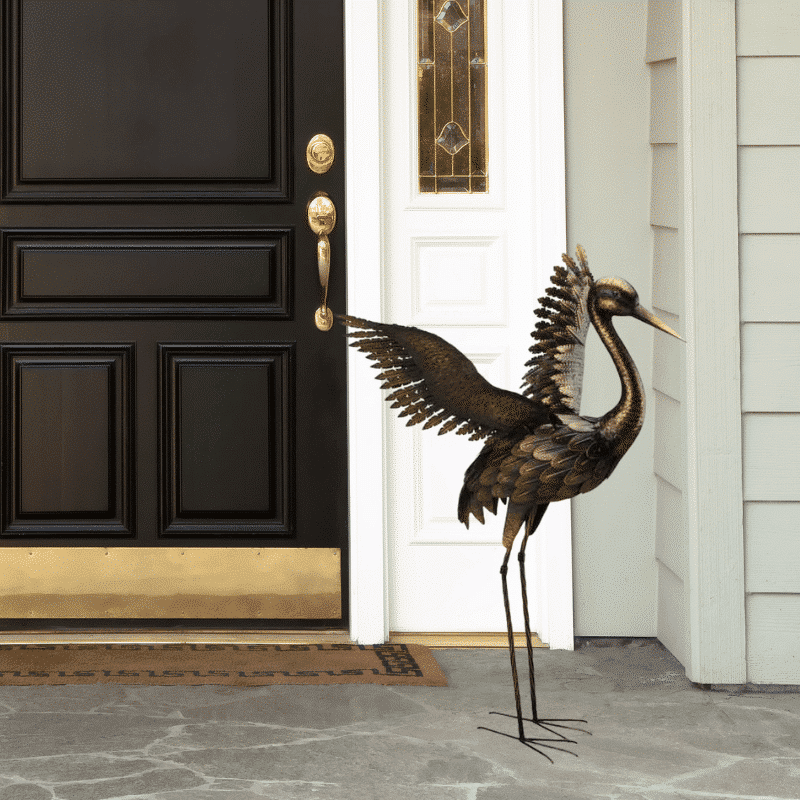 Exclusive handcrafted metal bird statuary features an impressive wing span and ornate feather detail. Use indoors as self-standing statuary in your home, or outdoors as patio or garden decor.