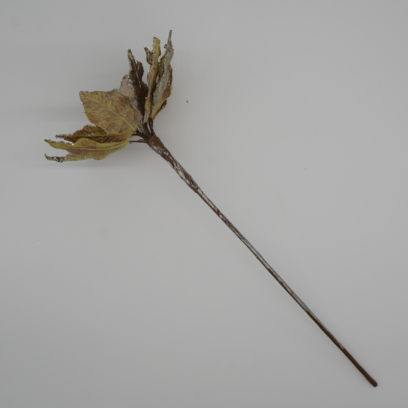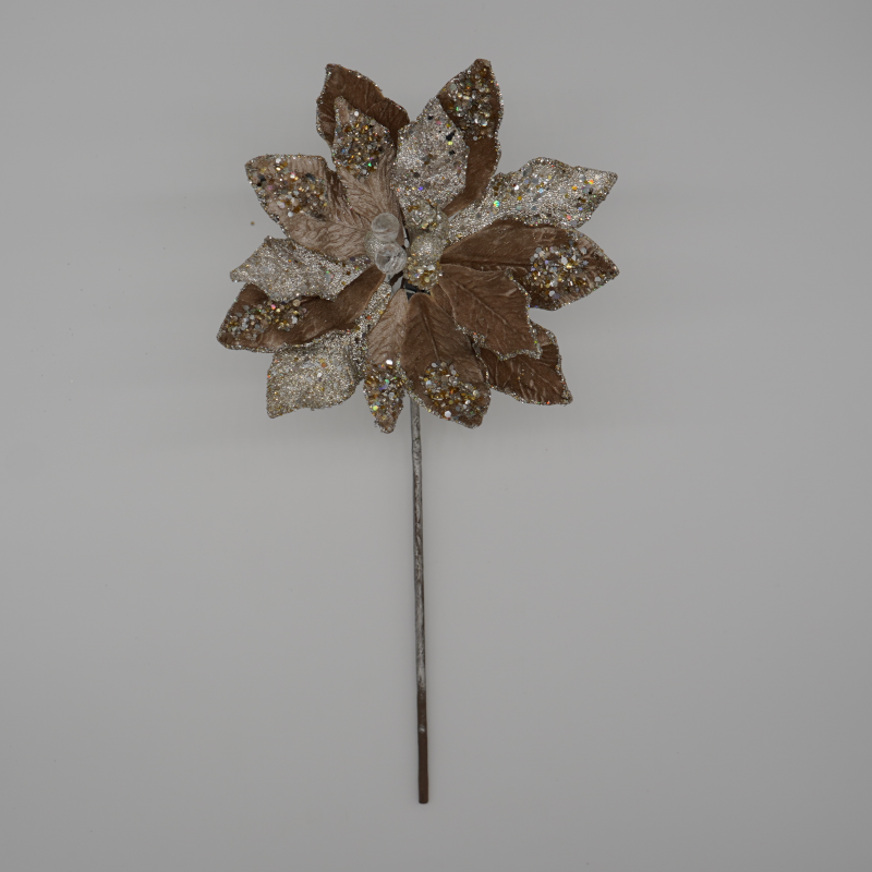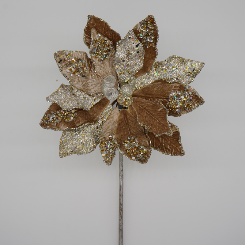 This elegant champagne and platinum poinsettia stem with beaded glitter accents is the perfect holiday decoration.