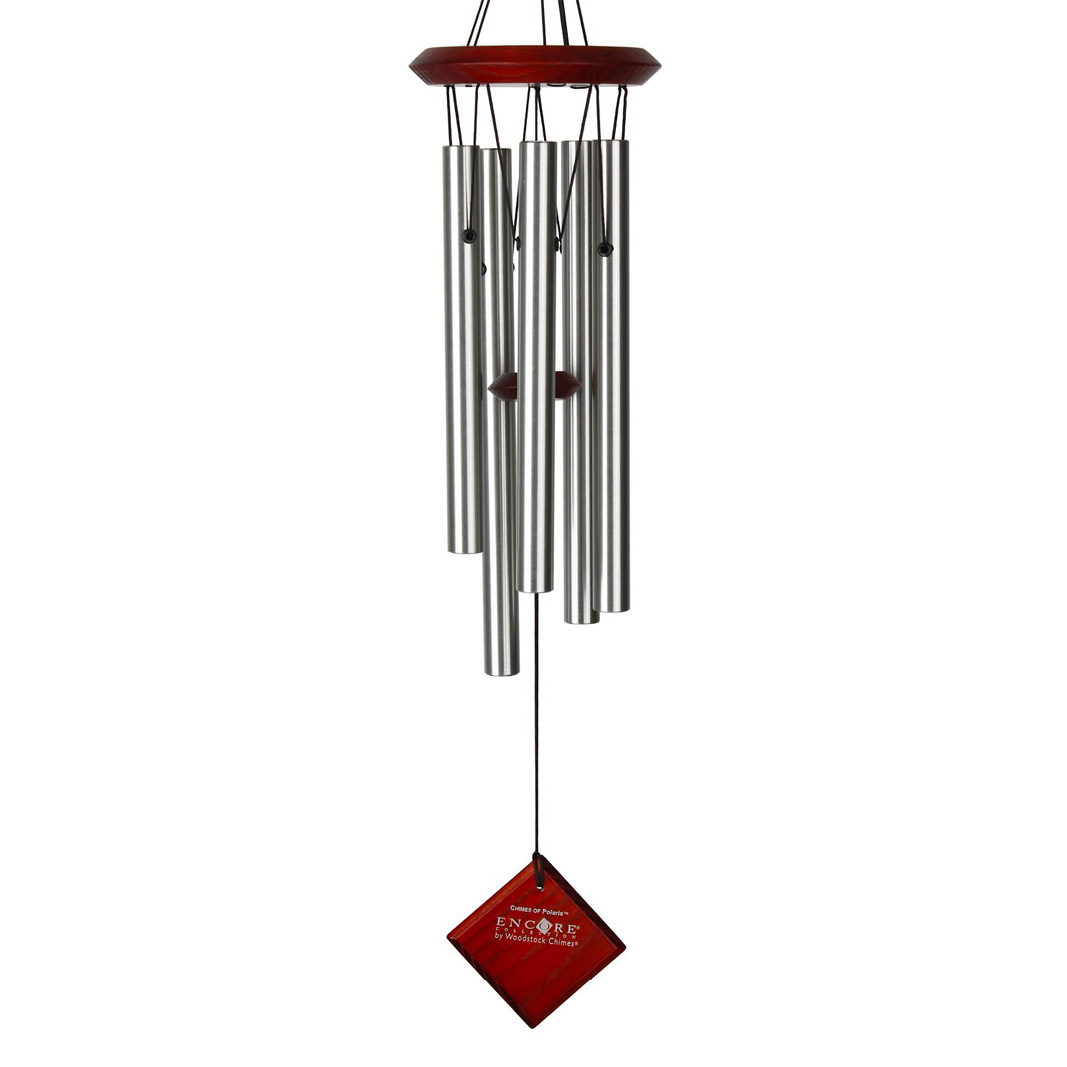 The 22-inch Chimes of Polaris windchime with silver aluminum tubes is named for the North Star, which marks Earth’s celestial north pole. This chime is tuned to a five-note scale for a harmonious sound.
