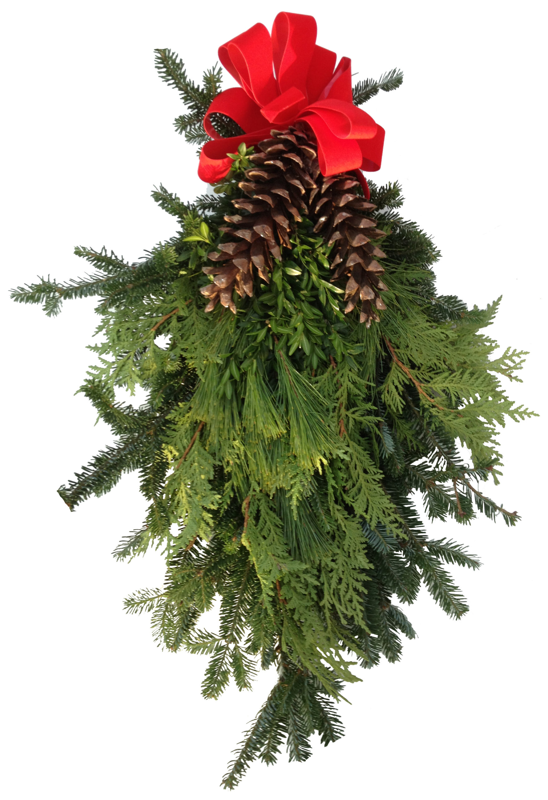 A mixed bunch of greens with a bow that’s a perfect front-door decoration.