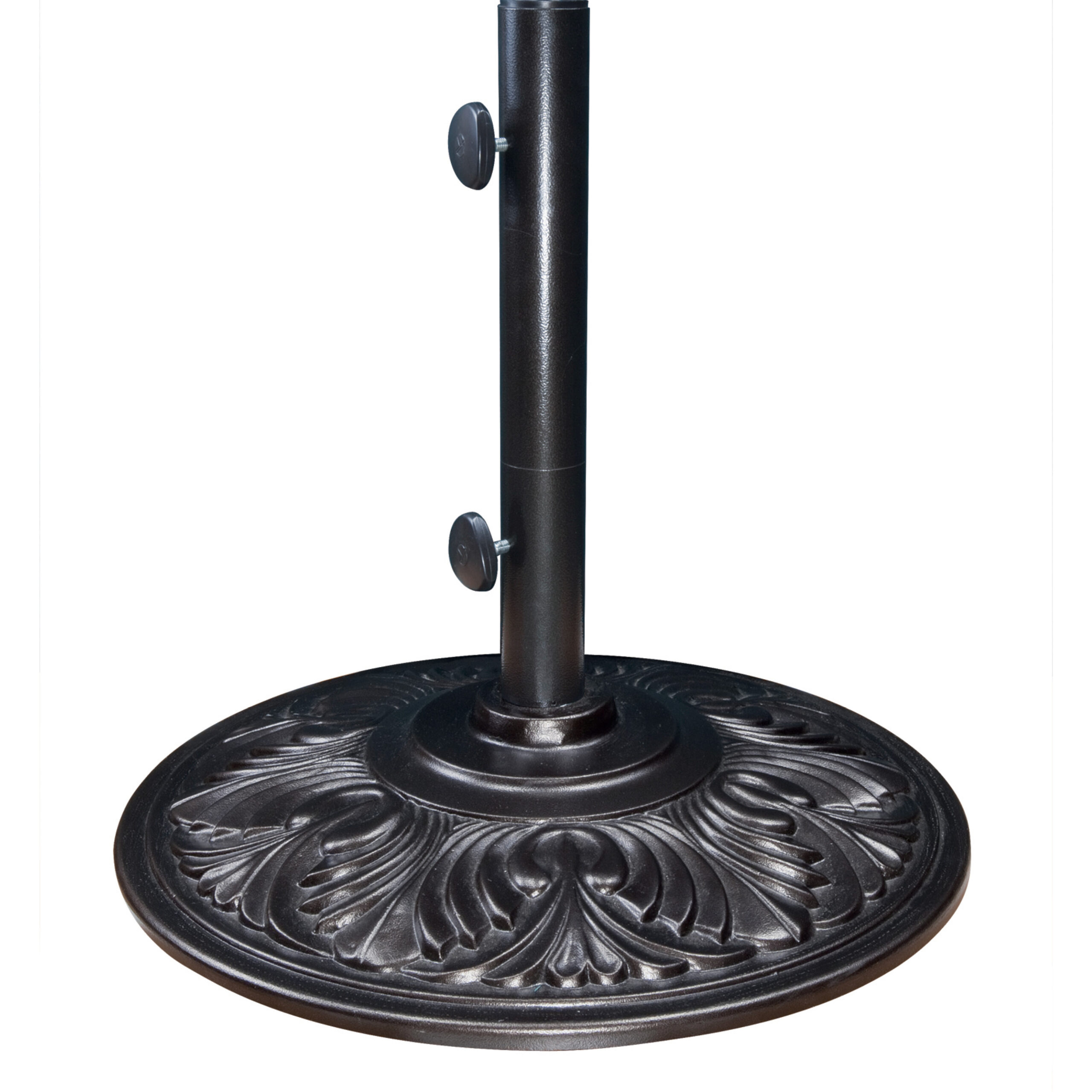 Decorative cast aluminum base hold patio umbrella upright.