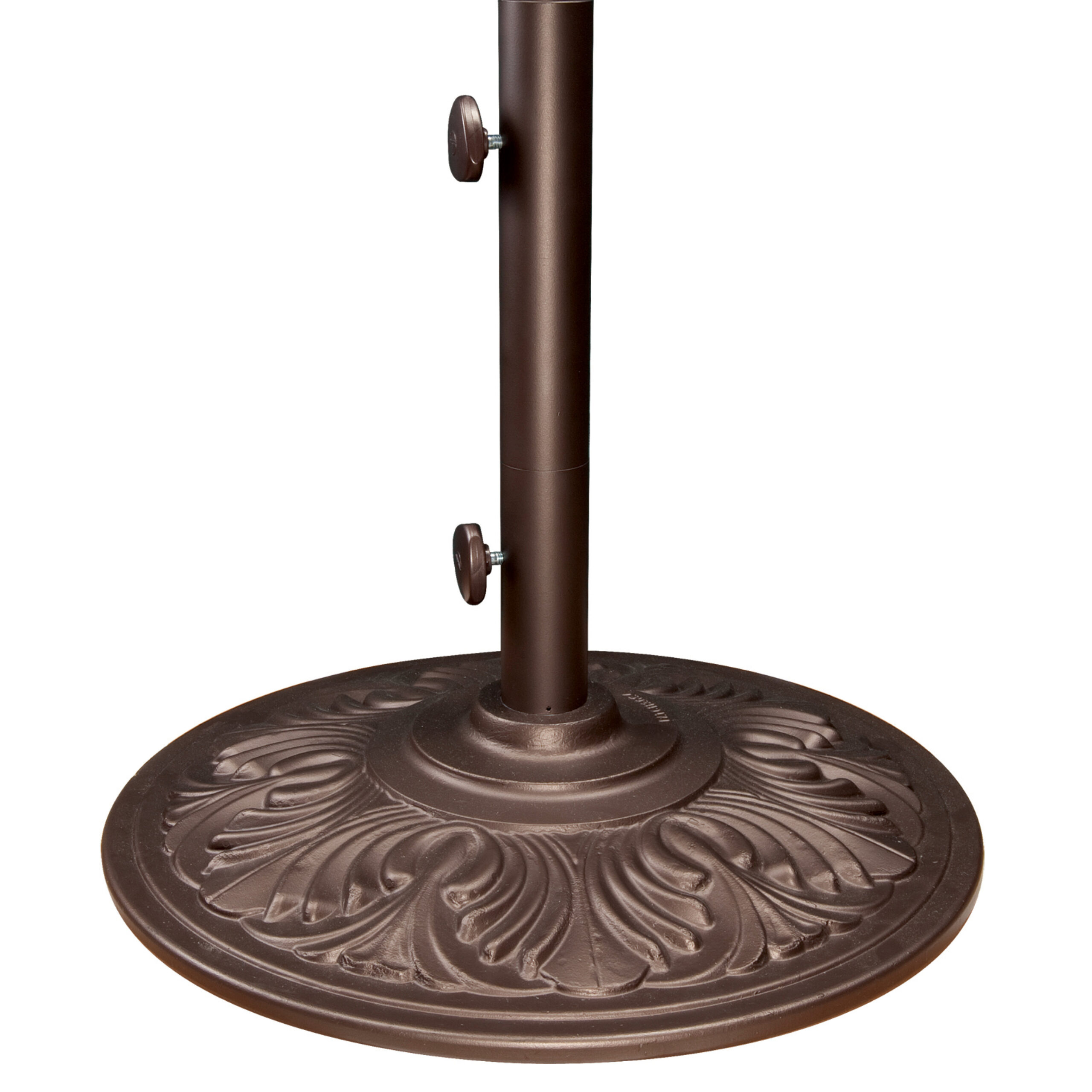 Decorative cast aluminum base hold patio umbrella upright.