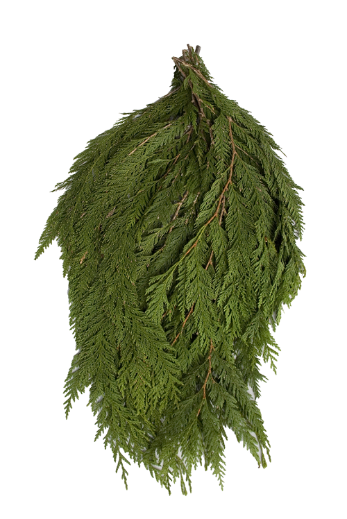 A small bunch of Western Red Cedar featuring delicate, textured greens with a medium-green color. Very fragrant.