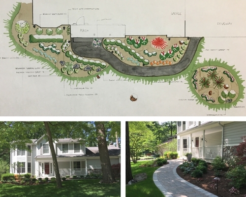 Designers Heidi Cook and Jim Morris created a beautiful new front landscape for this homeowner, resulting in a Gold Environmental Improvement Award from Michigan Green Industry Association. An inviting entrance was created by changing the shape of the walkway, planting shrubs and perennials, and enhancing the corner of the lot with groundcovers, shrubs and a new lawn.