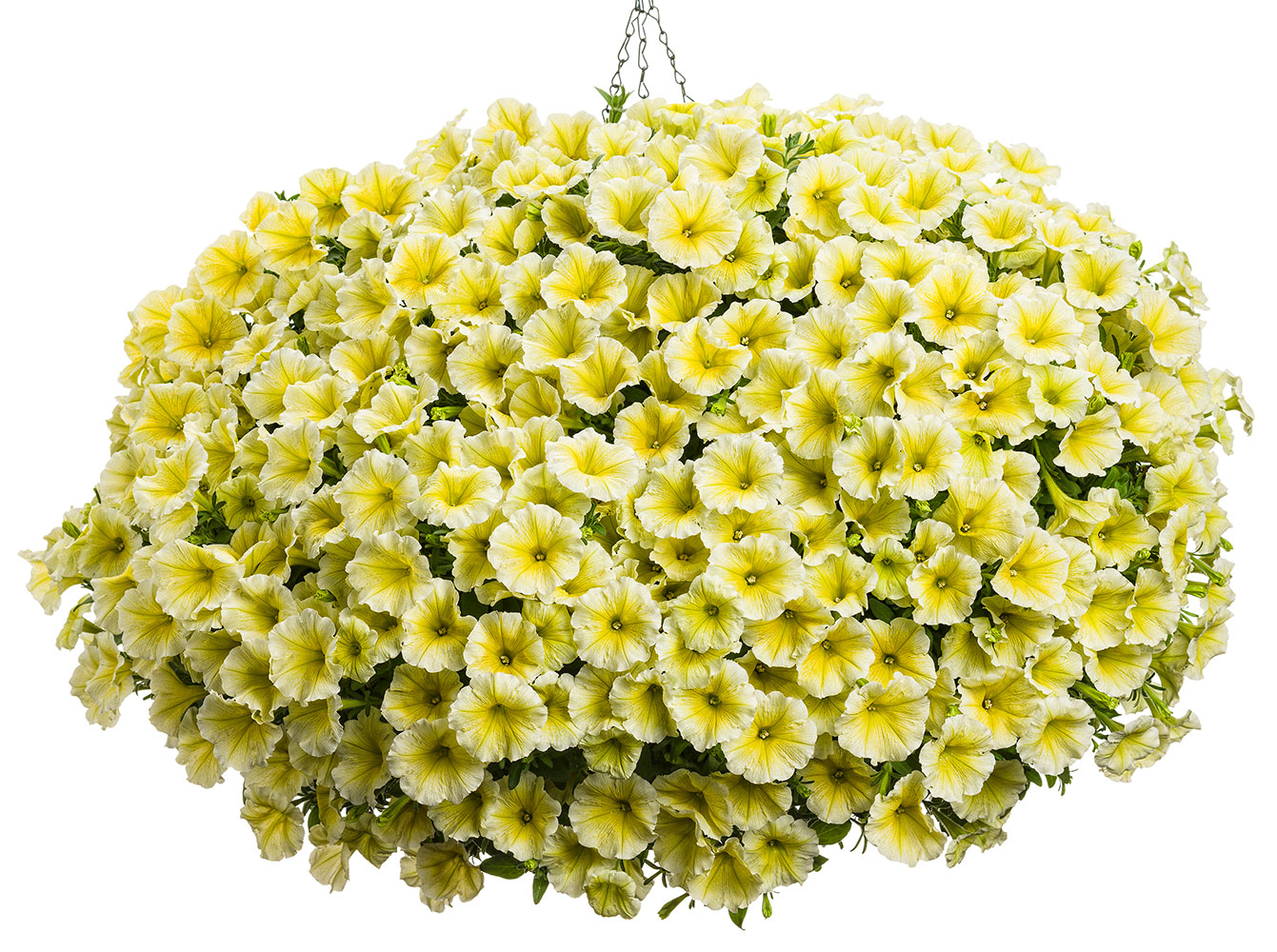Supertunia Limoncello has beautiful soft yellow flowers with darker yellow veins that creates a striking monochromatic hanging basket.