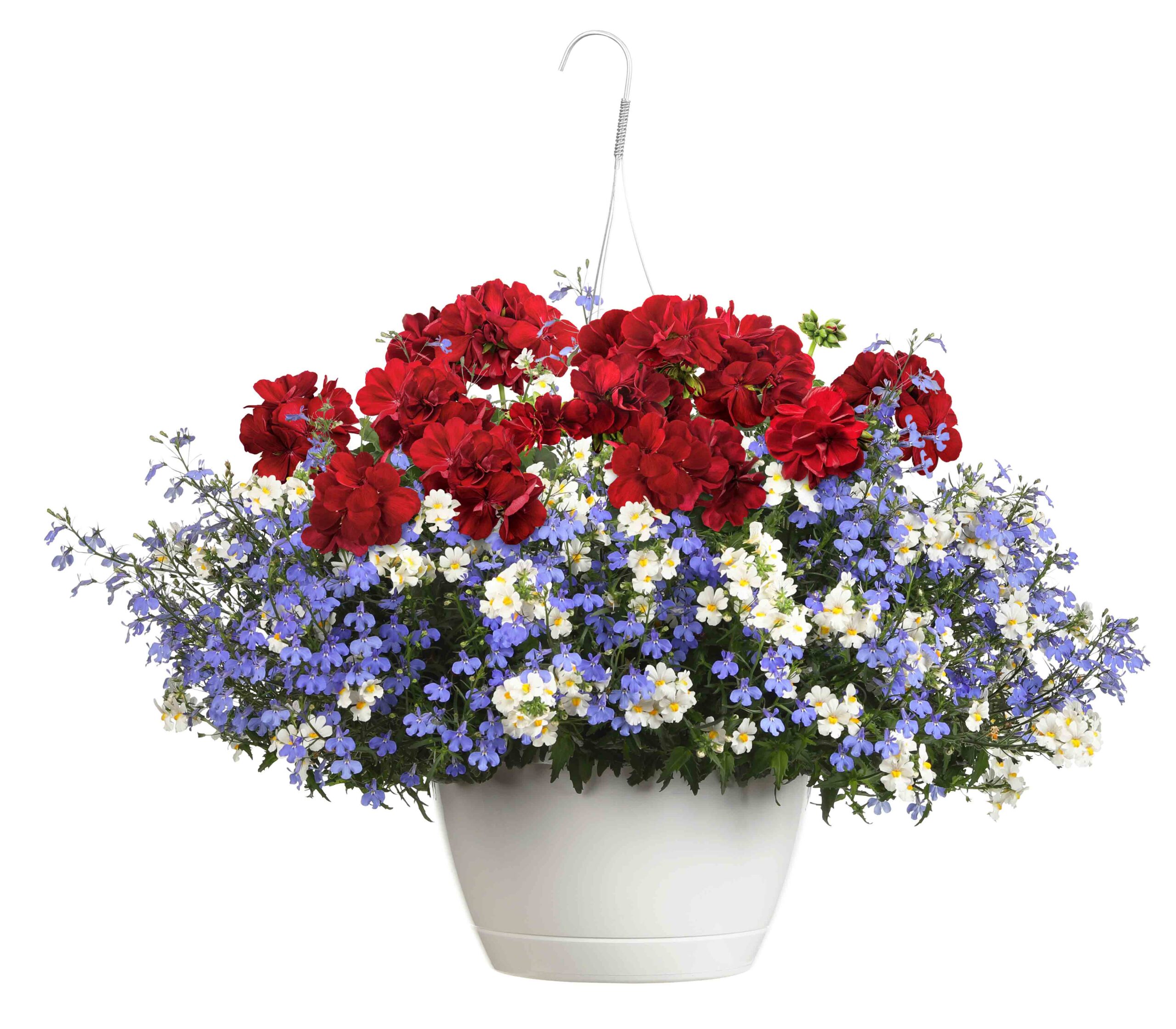 Boldly Dark Red Geranium, Sunsatia Coconut Nemesia, and Laguna Sky Blue Lobelia create a perfectly patriotic combination.