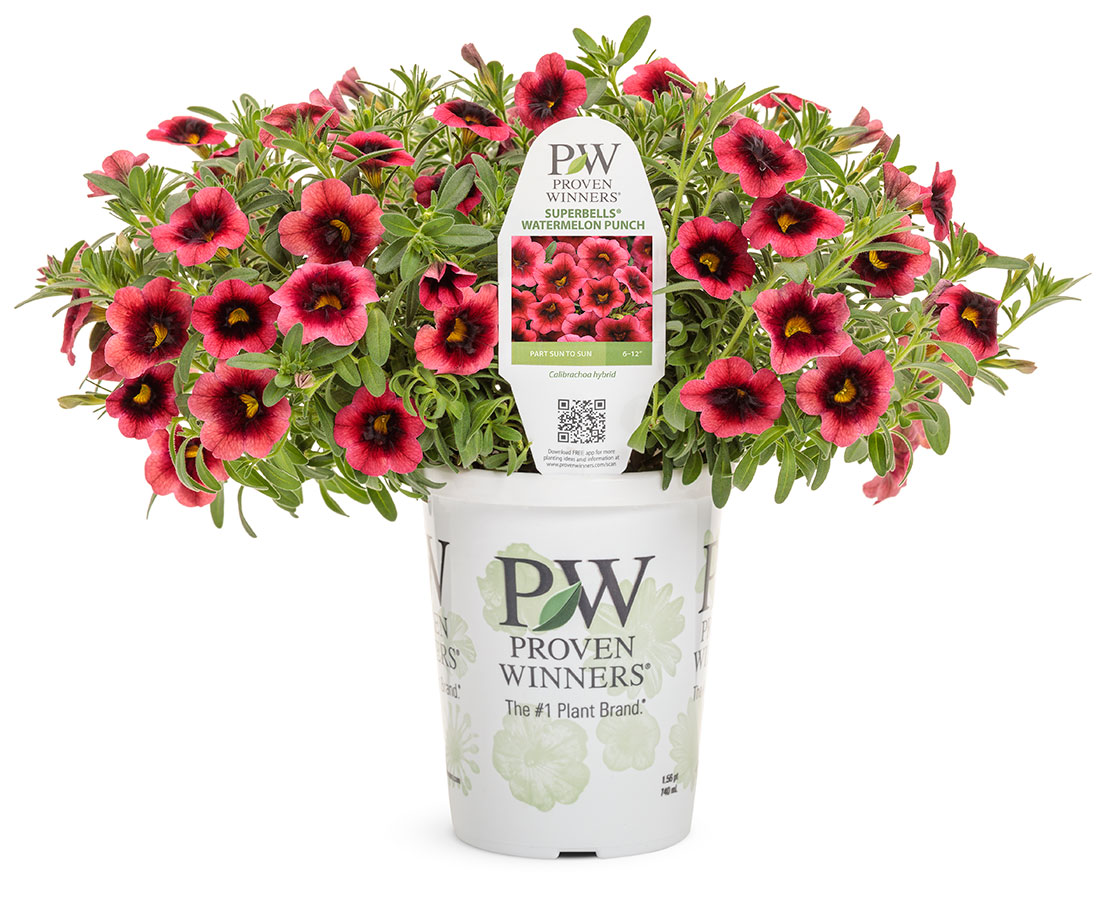 Superbells Watermelon Punch from Proven Winners displays coral pink flowers with a black eye.