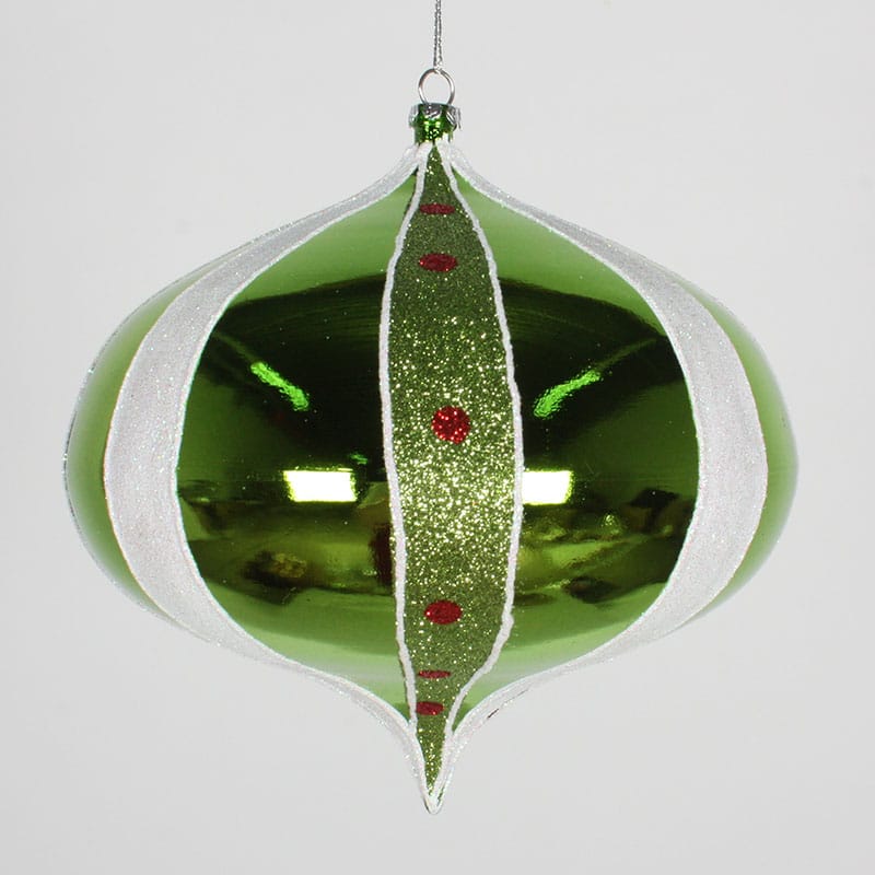 This 16 cm shiny lime green onion ornament is is covered with stripes and red polka dots.