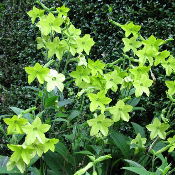Starry chartreuse petals blossom atop the lush foliage of this Nicotiana. The plant can reach up to 48 inches high, making it a thriller if planting in a container.