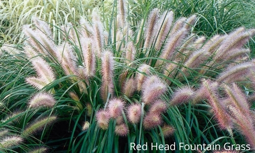 Fountain Grass is another common Perennial Grass. It looks best when planted with Daylilies, False Sunflower and Dahlias. Fountain Grass blooms fuzzy, white, pink or red plumes in later summer that last long into fall. The Burgundy Bunny Miniature Fountain Grass is a dwarf grass that features fiery red highlights in late spring with stunning red color in fall. English Gardens also carries the Red Head Fountain Grass which forms a low mound with purple plumes beginning in late summer. The foliage turns a slightly golden color in autumn.