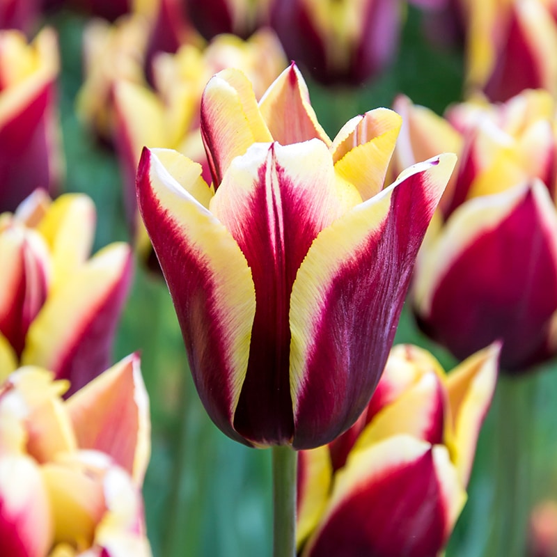 Dark mahogany flowers with bold yellow edges.