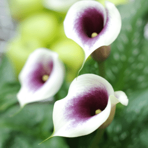These unique Calla Lilies start with a deep purple center and fade to white at the edges. Calla Lilies also make excellent container plants.