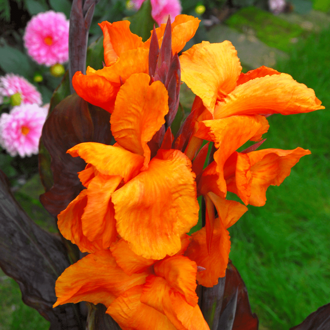 Add a cheerful touch to your garden with these stunning Canna blooms. Burgundy foliage topped with orange flowers makes these a must-have in the garden this summer.